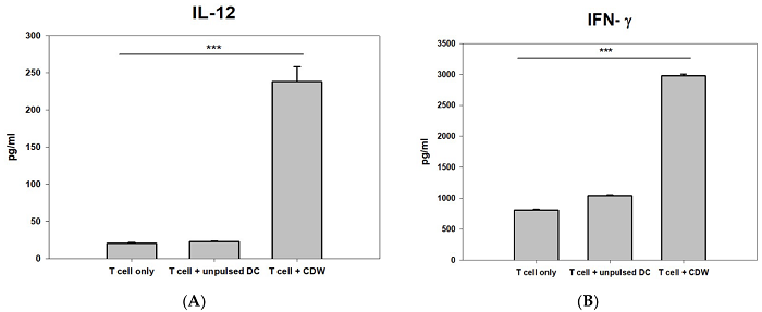이 외에도 T세포와의 상호작용을 통한 면역 반응을 확인했다. 일반 T세포와 CDW를 통해 분화를 유도한 T세포를 비교한 결과 CDW와 결합한 T세포에서 세포 면역 활성화에 중요한 역할을 하는 IL-12와 IFN-γ의